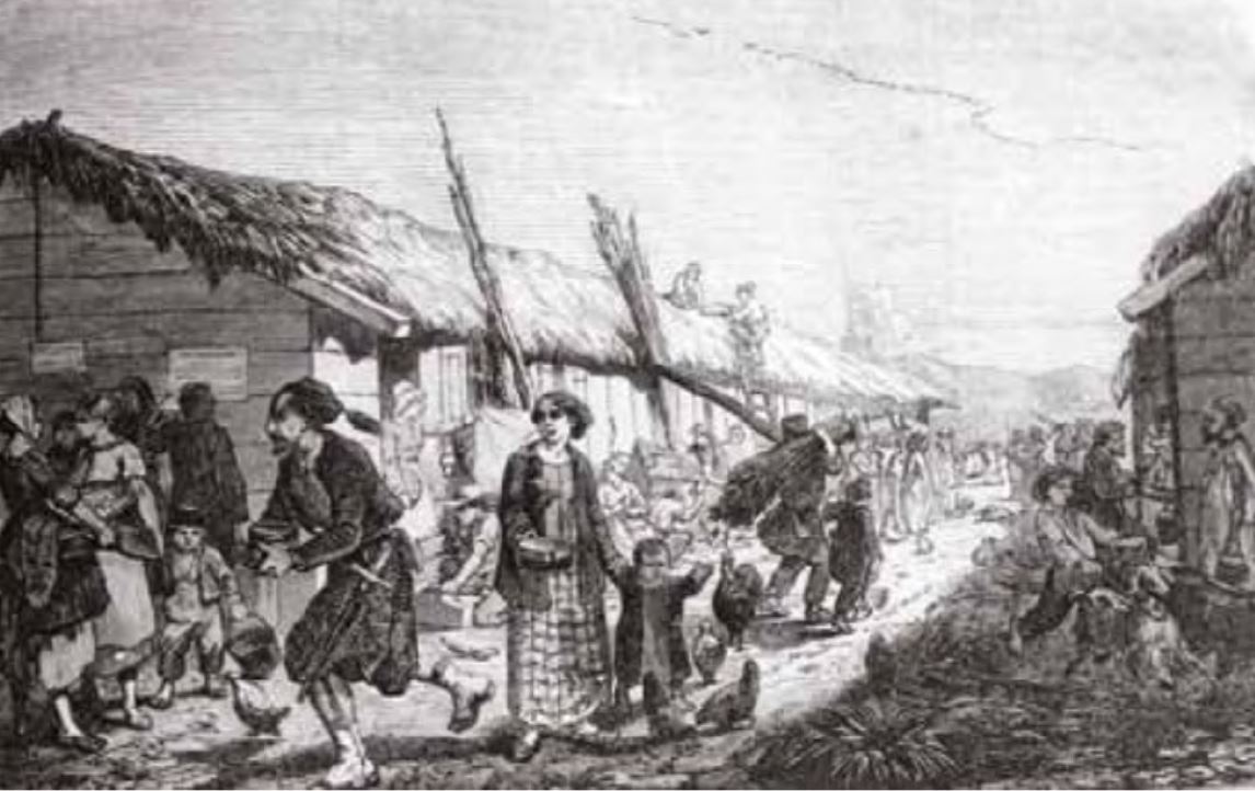 Une deuxième vague en 1848 se compose d’ouvriers des ateliers nationaux parisiens. Ces familles sont embarquées sous surveillance militaire à Bercy, transportées par péniche jusqu’à Marseille, s’entassent dans les cales des navires de guerre jusqu’à Alger. Stationnées dans des campements de fortune, les familles, ou ce qui n’a pas péri pendant le voyage, sont escortées par l’armée vers des sites où elles ont l’obligation de fonder des villages choisis selon des critères tactiques mais sans valeur agricole. L’armée leur donne des outils du Génie militaire, quelques sacs de semence et une mauvaise voiture d’attelage. Seuls les plus robustes survivent en creusant un trou sous le chariot et clouent des chiffons sur les ridelles. Ensuite, le cimetière se remplit plus vite que les sillons. Nombreuses sont les « faces de Boufarik », du nom d’un site malsain dans le marécage paludéen de la Mitidja, où le service de santé installe une ambulance qui sert plutôt de mouroir. Les colons se tuent à la tâche, aucun retour en métropole n’étant prévu, hormis aux dépens des partants, mais rares sont ceux qui en ont les moyens. Un document de concession n’est validé en acte de propriété que si la ferme s’avère autarcique dans un délai déterminé de quelques années selon les régions. Il ne faut pas compter sur les pouvoirs publics pour aider certains émigrants, en particulier ceux qui arrivent dans les semaines qui suivent le 2 décembre 1851, condamnés à la transportation + (plus = peine temporaire) ou + + (plus plus = assignés à résidence définitive et interdits de retour en métropole). Ces débuts tragiques du Second Empire prennent une tournure plus favorable lors de la visite officielle de Napoléon III qui proclame son fils roi d’Alger et favorise l’immigration, en particulier des Suisses, fondateurs de Zurich près de Cherchell.