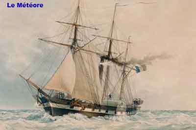 Nota : Le Météore fut lun des premiers navires à vapeur de la marine française. Construit à Rochefort en 1833, il faisait partie dune série dune vingtaine davisos à roues construits sur les mêmes plans, mis au point par Jean-Baptiste Hubert, ingénieur des constructions navales à Rochefort. Petits bâtiments de liaison et de transport denviron 45 mètres de long, les avisos à roues comportaient un équipage dune centaine dhommes. Ils étaient à lorigine chargés de porter les avis, cest-à-dire le courrier, doù leur nom d « aviso». http://www.maxisciences.com/navire/le-meteore_vid1789942.html