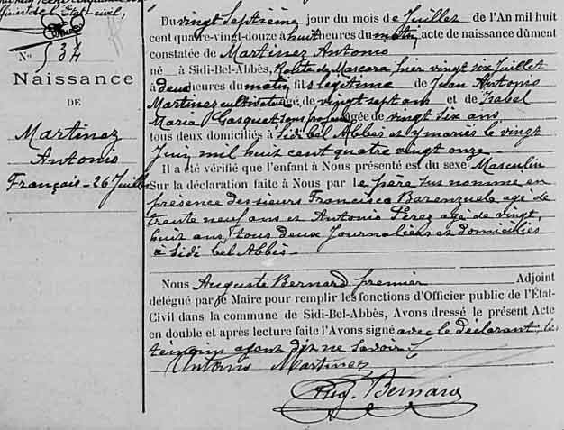 On peut ajouter de plus que son père né dans la même ville du département d'Oran, avait également accompli son service militaire en 1889 et qu'il avait obtenu la notification officielle de sa naturalisation en 1903.